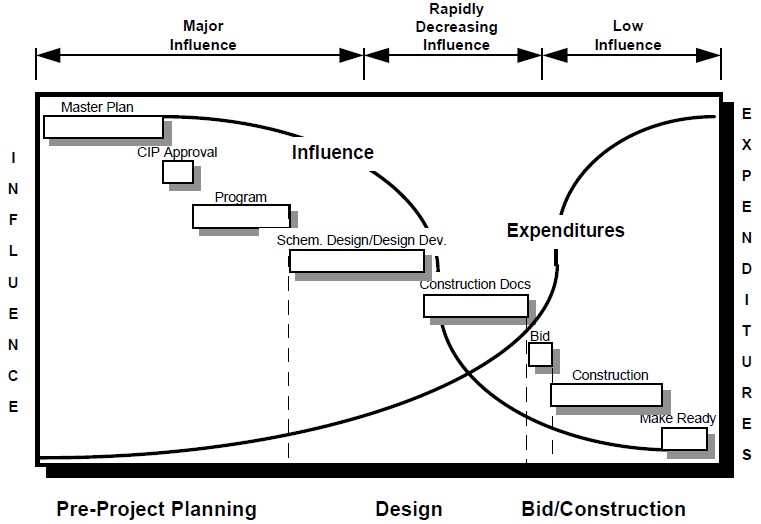 The figure below depicts the underlying premise of programming: You can influenence/affect the outcome of a project the most during pre-project planning and for the smallest expenditure. Conversely, exerting a small influence on a project during construction (read change order) has a high relative associated expenditure.